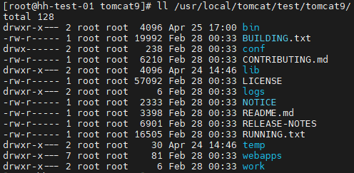 [root@hh-test-01 apache-tomcat-9.0.73]# cp -a * /usr/local/tomcat/test/tomcat9/